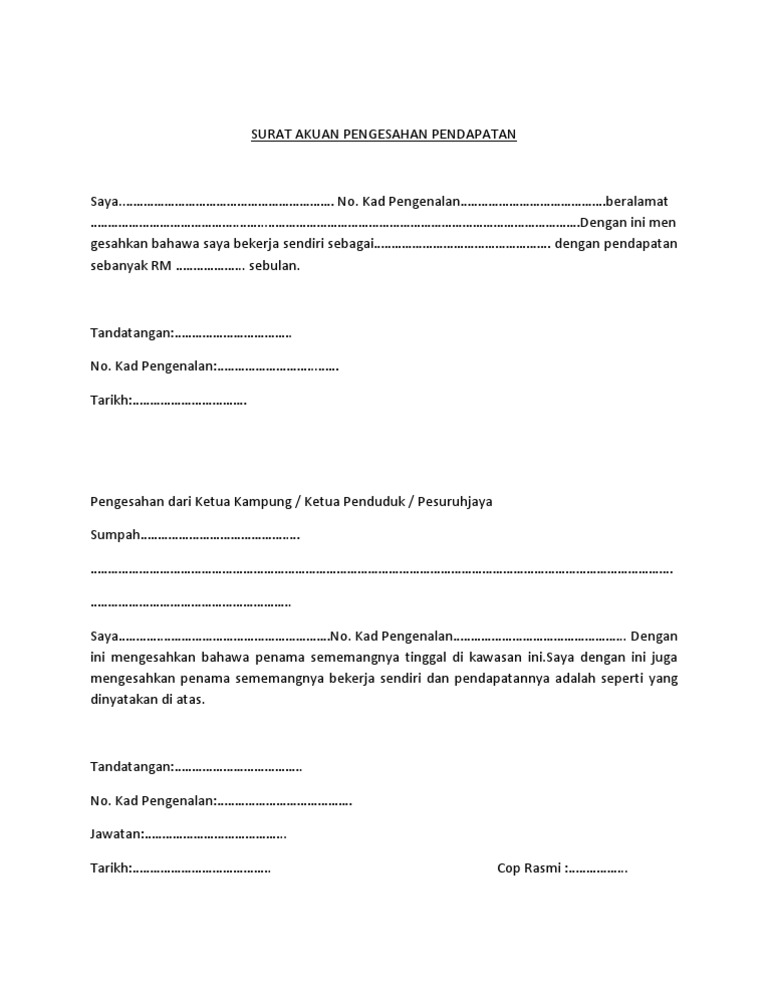 Contoh surat rasmi pengesahan pendapatan bekerja sendiri via contohbee.blogspot.com. Surat izin dari pemerintah tersebut dibutuhkan oleh pelaku usaha perseorangan maupun pelaku usaha yang telah berbadan hukum. Seorang karyawan tentu mendapatkan gaji atau penghasilan dari perusahaan atau lembaga tempatnya bekerja. Contoh surat akuan pendapatan sendiri surat akuan pengesahan pendapatan adalah khusus buat individu yang bekerja sendiri dan tidak mempunyai slip gaji. Bermula 8 jun 2021, polis diraja malaysia, pdrm hanya menerima surat pengesahan daripada sembilan kementerian/agensi berkaitan sebagai bukti yang.